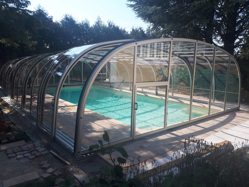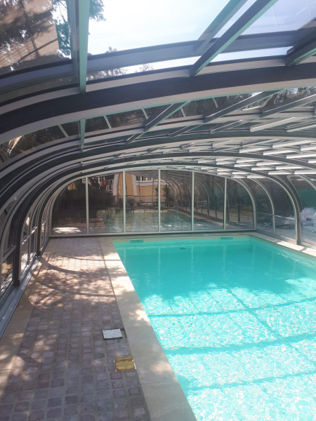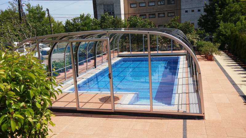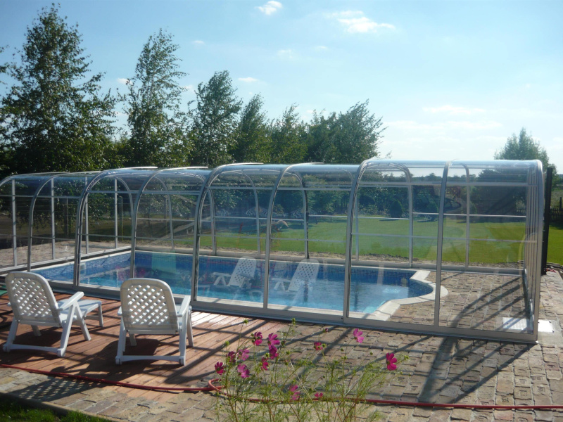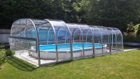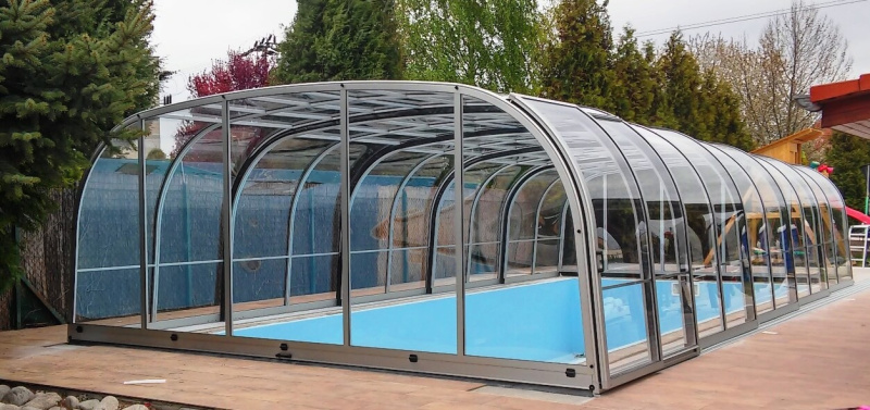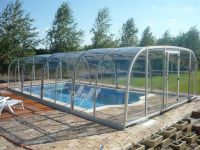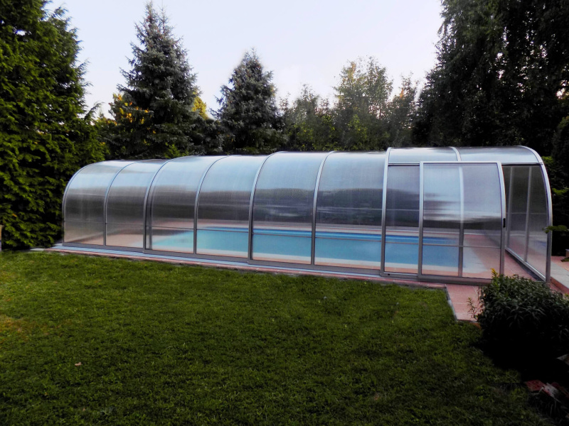Zakrytie bazéna v štýle oblúkov s vysokým košom, s plným alebo viacstenným polykarbonátovým zasklením. Naše patentom chránené profily majú zaoblené hrany a rohové body pre prípad, že by sa predišlo nehode. Výška sa mení v rozmedzí 2,10 - 2,45 m v závislosti od šírky.