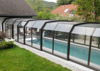 - Z terasy domu alebo z okna je cez priehľadný polykarbonát bez problémov vidieť do bazénu alebo z bazénu do záhrady. Pojazdné dráhy sú umiestnené po oboch stranách a sú elegantným a účelným riešením manipulácie s týmto modelom