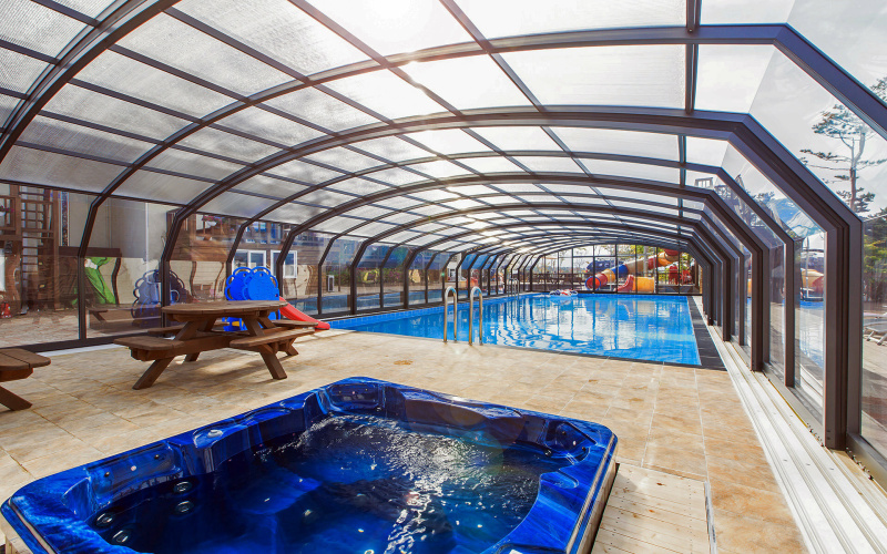 Steny sú vždy vyrobené z kompaktného polykarbonátu, zatiaľ čo strecha pozostáva z jednokomorového alebo trojkomorového polykarbonátu. Z terasy domu alebo z okna je cez priehľadný polykarbonát vidieť do bazénu alebo do záhrady.