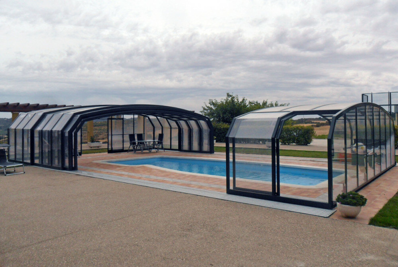 - Z terasy domu alebo z okna je cez priehľadný polykarbonát bez problémov vidieť do bazénu alebo z bazénu do záhrady. Pojazdné dráhy sú umiestnené po oboch stranách a sú elegantným a účelným riešením manipulácie s týmto modelom
