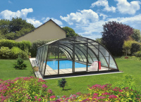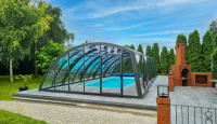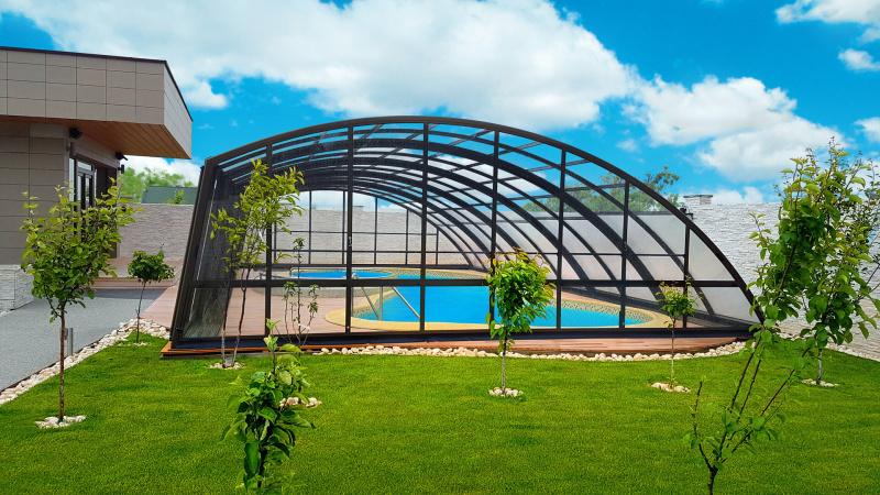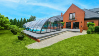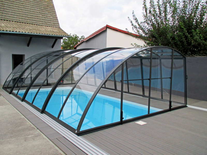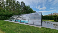 - Pohyb bez obmedzení u tohto typu zastrešení je možný okolo 3 strán bazénu. Posuvné dvere sú umiestnené vo vertikálnej bočnej stene, najviac posuvné alebo otváracie dvere môžu byť v prednej a zadnej stene.