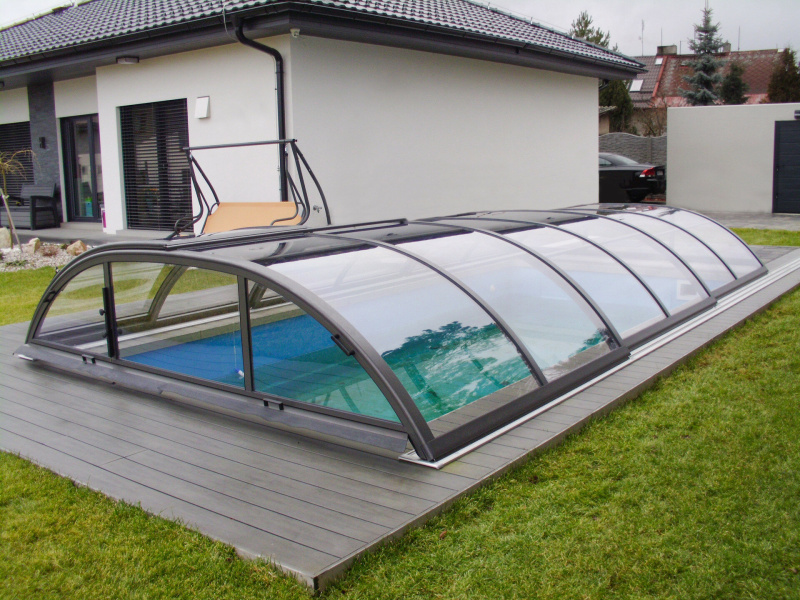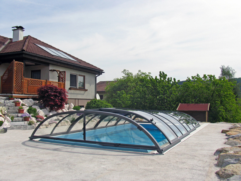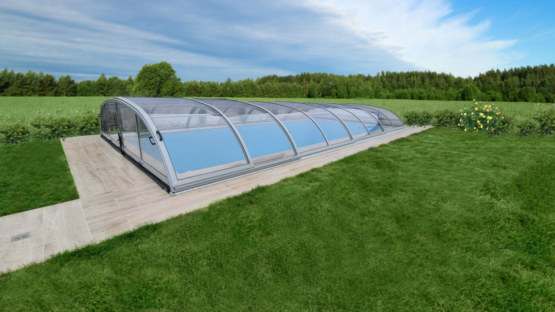 Zastrešenie bazénov Elegant NEO poskytuje komfort pri plávaní vďaka optimálnej klenbe aj v zakrytom stave. Navyše ničím nenarúša ráz záhrady.