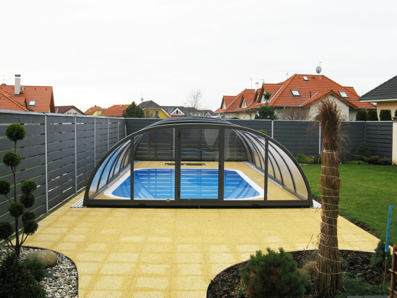 - čelné steny zastrešenia vnútorné, fixné, vyrobené z polykarbonátu a hliníkových profilov